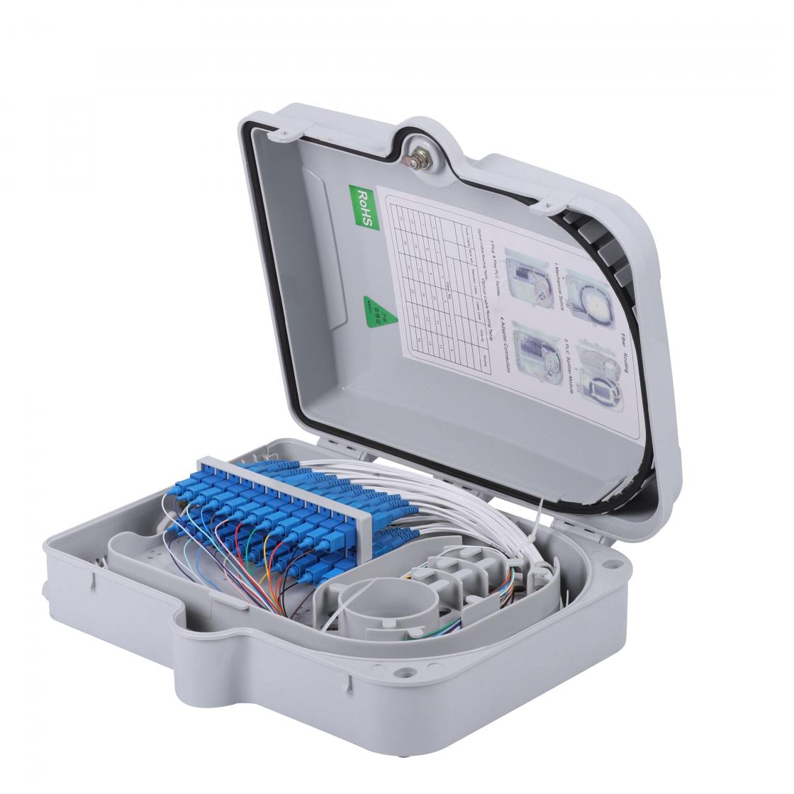 Для изготовления оптического бокса используется специальный пластик устойчивый к воздействию ультрафиолетовых лучей, позволяющий эксплуатации в условиях широкого диапазона низких и высоких температур. Герметичный корпус позволяет применять оптический бокс как в здании так и при уличном монтаже.